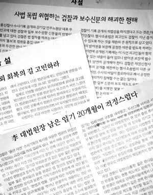 한겨레는 19일 사설 ‘사법독립 위협하는 검찰과 보수신문의 해괴한 행태’에서 “몇몇 신문은 재판 내용과 무관한 판사 개인의 성향을 문제삼아 ‘마녀사냥’ 식의 선동으로 법원을 비난하고 있다”며 “사법부의 독립을 심각하게 위협하는 행태가 아닐 수 없다”고 말했다.