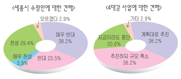 정부가 추진하는 4대강 사업에 대해서는 “추진하되 규모를 줄여야 한다”와 “계획대로 추진해야 한다”는 의견이 각각 38.2%(13명)로 동률이었다. “지금이라도 중단해야 한다”는 응답은 20.6%(7명), 기타 2.9%(1명)였다.