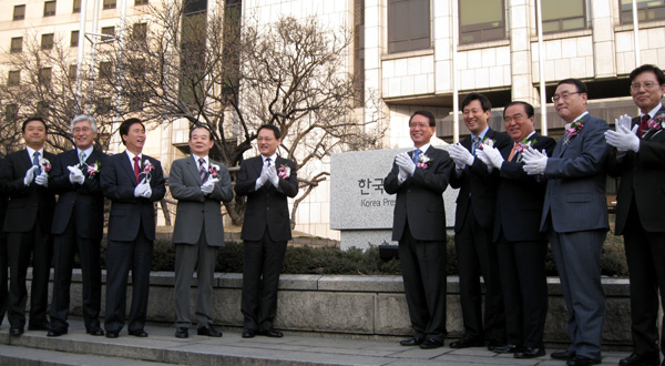 ▲ 1일 서울 중구 태평로 한국프레스센터 앞에서 김형오 국회의장, 유인촌 문화체육관광부 장관, 이성준 한국언론진흥재단 이사장, 오세훈 서울시장, 고흥길 국회문화체육관광방송통신위원장이 한국언론진흥재단 표지석 제막식을 갖고 있다. |