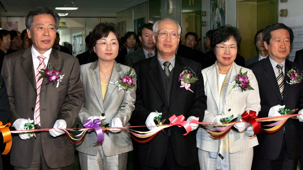 ▲ 지난 2005년 4월 지역신문발전위원회 사무실 개소식에서 테이프를 자르고 있는 김태진 지역신문발전위원장(왼쪽에서 세번째) 등의 모습.(연합뉴스) |