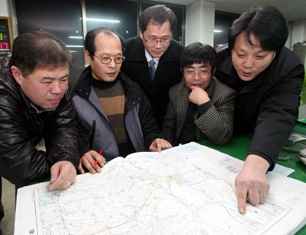 ▲ 강 탐사는 지도에서 물길의 흐름을 확인하는 것에서 시작한다. 팀원들이 본격 탐사에 앞서 탐사 대상지를 살펴보고 있다. 사진 왼쪽부터 최병호 차장, 김대홍 부장, 최준일 차장, 김형길 부장, 백세종 기자. |