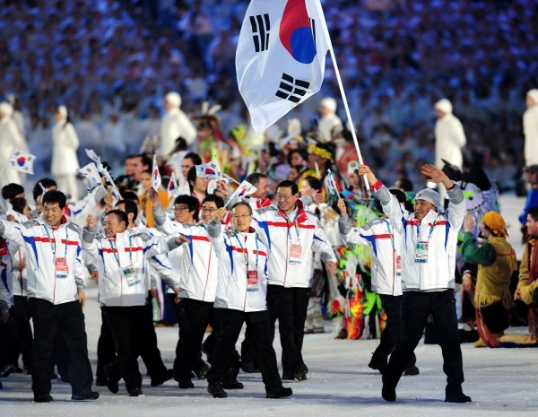 ▲ 13일 오전(한국시간) 캐나다 밴쿠버 BC 플레이스에서 열린 2010 밴쿠버 동계올림픽 개막식에서 대한민국 선수단이 입장하고 있다.(뉴시스) |