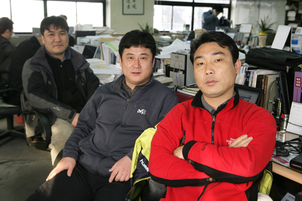 강희만 팀장, 이승철 기자, 강경민 기자“자료사진 많이 남겨줘야 하니까 최대한 많이 찍어둬라.” 현장으로 나가는 후배 사진기자들에게 매일같이 강희만 팀장이 건네는 한마디다. 취재지시에 따라 장비를 챙기고 촬영 장면을 정하느라 강희만 팀장과 강경민·이승철 기자 등 사진부의 아침은 항상 바쁘다.