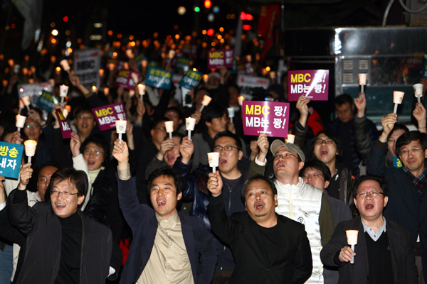 ▲ 지난달 26일 서울 여의도 MBC 사옥 앞에서 열린 ‘공영방송 MBC 지키기 촛불문화제’에 참석한 시민들이 “공영방송 MBC 사수”를 외치고 있다. (전국언론노조 제공) |