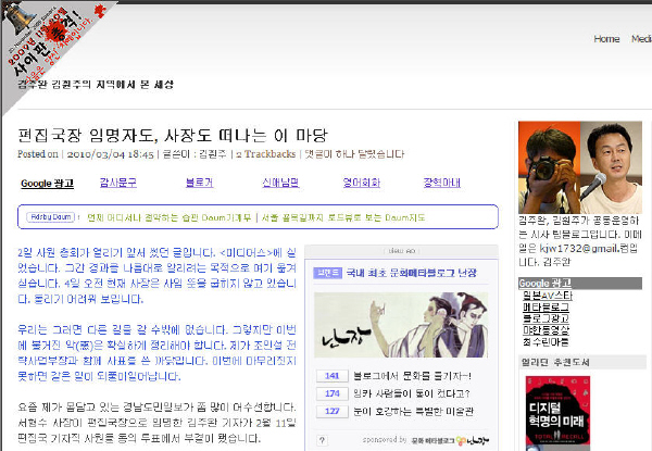 | ▲ 사장 사퇴 파문에 대한 글이 게재된 김훤주 경남도민일보 기자의 블로그. | ||