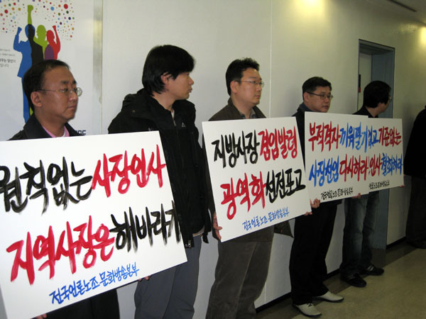 | ▲ 19개 지역 MBC 지부장 등 노조원들이 8일 여의도 MBC 본사 10층 소회의실에서 ‘지방사장 겸임발령 광역화 선전포고’ 등의 팻말을 들고 시위를 벌이고 있다. | ||