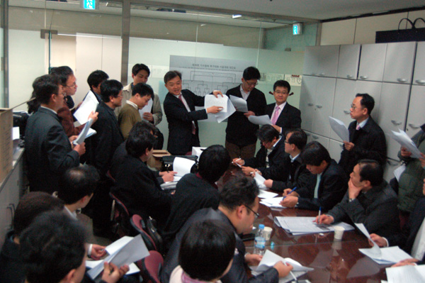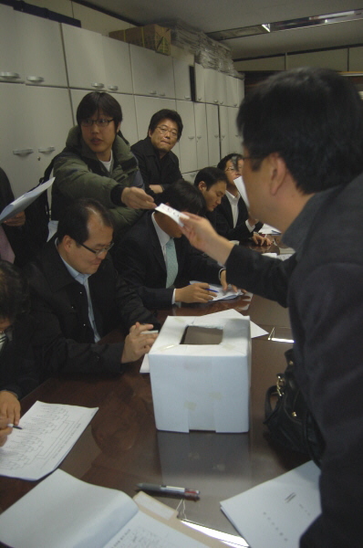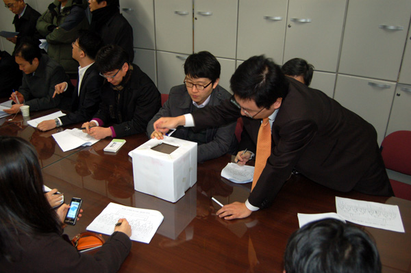 | ▲ 16일 서울 한국프레스센터 한국기자협회 회의실에서 열린 기자협회 축구대회 서울대회 조추첨에서 한 지회장이 추첨표를 뽑아 건네고 있다. | ||