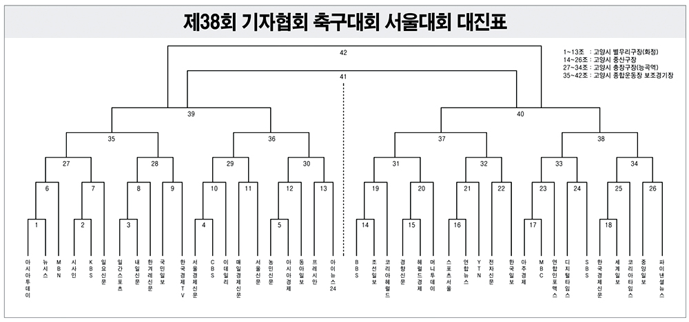 추첨 결과 △아시아투데이-뉴시스 △시사인-KBS △일간스포츠-내일신문 △국민일보-한국경제TV △서울경제신문-CBS △매일경제신문-서울신문 △농민신문-아시아경제 △프레시안-아이뉴스24 △BBS-조선일보 △경향신문-헤럴드경제 △스포츠서울-연합뉴스 △전자신문-한국일보 △아주경제-MBC △디지털타임스-SBS △한국경제신문-세계일보 △중앙일보-파이낸셜뉴스가 첫 경기를 펼친다.