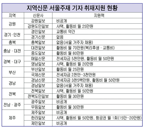 본보가 지역신문 20개사 총무국에 서울 주재기자에 대한 지원책을 문의해 조사한 결과 전세금 및 사택을 지원한다고 답한 곳은 7곳에 불과했다.