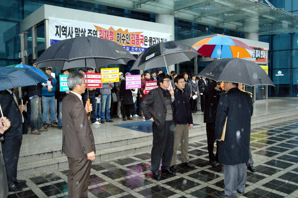겸임사장 일주일째 출근 못해김재철 사장이 진주·마산 MBC 광역화 추진을 위해 발령한 김종국 진주·마산 MBC 겸임 사장은 일주일째 출근을 저지당했다. 16일 아침 진주 MBC에 출근할 예정이던 김 사장은 이날 출근하지 않았다. 진주 MBC 정대균 노조위원장은 “광역화 논의는 진주에 독자 사장을 선임한 뒤 지역민들의 여론을 들어 시작해야 한다”며 “겸임 사장이 철회될 때까지 출근저지를 계속할 것”이라고 말했다.