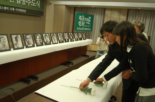 고 이의직 위원의 아들인 미술평론가 이주헌씨를 보자 아버지의 친구들은 손을 꼭 잡았다. “여전히 아버지를 닮았다” "네 책 열심히 읽었다"고 반가워했다. 그는 유가족을 대표해 단상에 섰다.