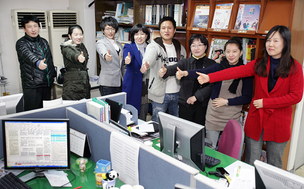 ▲ “준비 완료!” 중부권 최고의 신문을 만드려는 중부매일 편집부는 창작의 고통을 마다하지 않는다. 사진 왼쪽부터 최나훈, 지윤정, 이동수, 송창희, 김철기, 김금란, 이주경, 박은지 기자. |