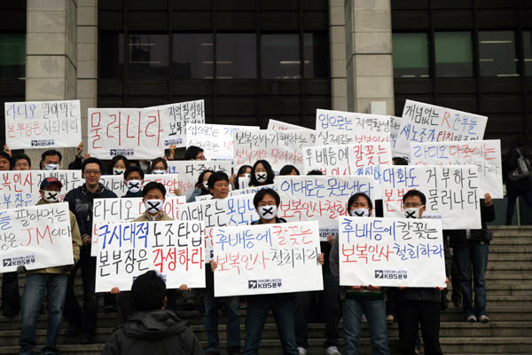 ▲ 전국언론노조 KBS본부 조합원들이 30일 서울 여의도 KBS 본관 계단 앞에서 라디오 PD 지방발령 철회 및 간부 퇴진을 촉구하는 침묵시위를 벌이고 있다. <전국언론노동조합 KBS본부> |