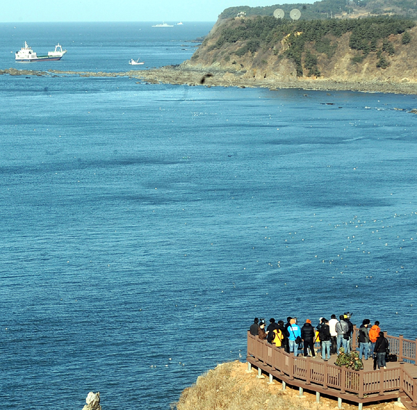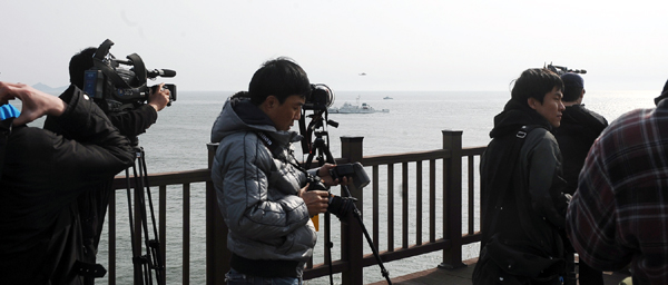 | ▲ 서해 백령도 서남쪽 1마일 해상에서 경비 활동 중이던 우리 해군 초계함 천안함(1천200t급)이 26일 오후 9시 45분께 침몰한 가운데 27일 오후 인천 옹진군 백령도 용트림 바위에서 취재진들이 수색작전을 취재하고 있다.(뉴시스) | ||