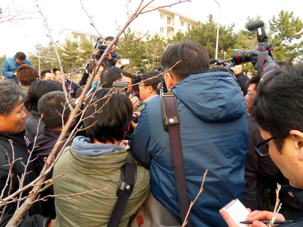 | ▲ 27일 해군2함에 모인 실종가족들이 부대측이 사고원인 해명에 소극적으로 대처한다며 불만이 쌓인 가운데 부대정문 초병을 밀치고 강제로 진입하고 있다. 이 과정에서 초병들과 가족들간에 극심한 몸싸움이 벌어졌지만 큰 불상사는 없었다. (뉴시스) | ||