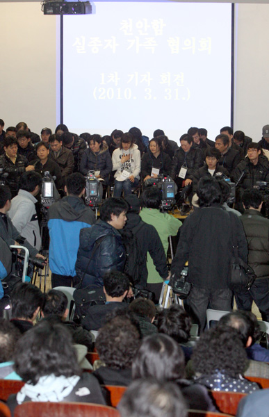 | ▲ 천안함 침몰 6일째인 31일 경기 평택 해군제2함대에서 천안함 실종자 가족들이 기자회견을 갖고 있다.(뉴시스) | ||