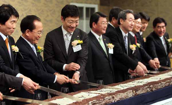 ▲ 6일 대전 유성호텔에서 열린 제54회 신문의날 기념 만찬에서 김재호 신문협회 회장(왼쪽에서 세번째) 등 참석자들이 축하 떡을 자르고 있다. (연합뉴스) |