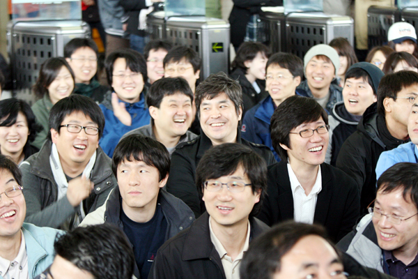 ▲ MBC 노조 총파업 이틀째인 6일, 여의도 MBC 사옥 1층 로비에서 열린 집회 도중에 노조원들이 환하게 웃고 있다. |