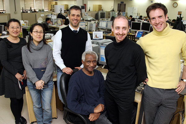 ▲ 왼쪽부터 중국어뉴스팀 에디터 태정희, 일본어뉴스팀 에디터 고마츠 토모코, 영문뉴스팀 에디터 피터 셔먼, 아랍어뉴스팀 에디터 이브라힘 무스타파, 프랑스어뉴스팀 에디터 브루노 파옌, 영문뉴스팀 에디터 에드워드 타겟씨. |