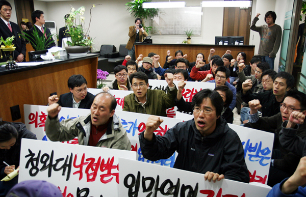 ▲ 8일 오후 김재철 MBC 사장이 회에 들어왔다는 소식에 사장실 앞에 모인 노조원들이 연좌농성을 벌이며 구호를 외치고 있다. |