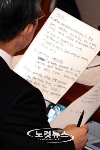 2일 오후 김 장관이 받아들고 있던 이 메모를 찍을 당시현장에는 CBS 노컷뉴스 외에도 한국일보와 연합뉴스, 인터넷신문 기자가 있었으며 관련 사진을 함께 찍은 것으로 알려졌다.