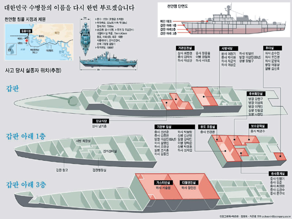 동아·조선·중앙일보는 13일자에서 천안함 함미의 인양 상황을 그래픽 기사로 처리했다. 조선은 천안함의 단면을 그래픽 처리해 부위별로 침몰원인을 설명, 주목을 끌었다.