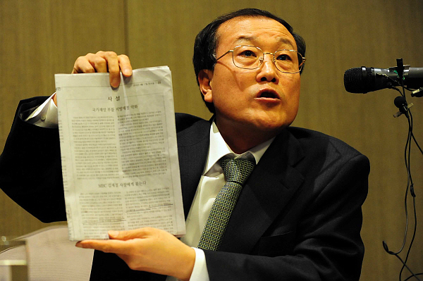 ▲ 김재철 MBC 사장이 18일 오후 서울 마포구 공덕동 롯데시티호텔에서 기자회견을 하는 도중 한겨레신문의 사설에 대해 반박하고 있다. <뉴시스> |