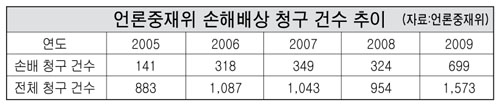 언론중재위에 따르면 언론보도에 관련한 손해배상 청구 건수는 2008년 3백24건에서 2009년 6백99건으로 2배가량 늘어났다. 올해는 3월까지 3백57건에 이르러 이 추세대로라면 지난해를 훨씬 웃돌 것으로 예상된다. 지난해 언론중재위를 통해 제기된 손해배상 청구 6백99건 중 인용된 것은 총 32건(인용률 4.5%)이다.