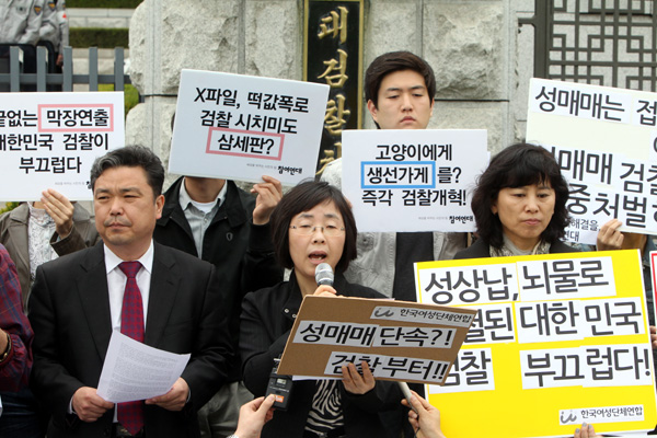 ▲ 경남지역의 건설업체 대표 정모씨가 MBC `PD수첩' 프로그램에서 검찰 고위 간부 2명의 실명을 거론하며 금품과 향응을 제공했다고 주장하고 나선 가운데 21일 오후 서초동 대검찰청 앞에서 참여연대와 한국여성단체연합 회원들이 기자회견을 갖고 해당 검사에 대한 철저한 수사와 처벌을 촉구하고 있다. (연합뉴스) |