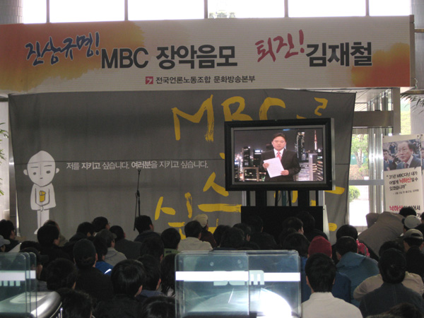 엄 위원장의 격려사가 끝난 뒤 노조원들은 20일 방송된 PD수첩 ‘검사와 스폰서’ 편을 다시 보면서 공영방송 수호 의지를 다졌다.