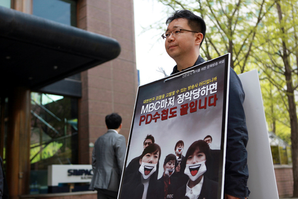 ▲ 김재철 사장의 임시 집무실이 마련된 서울 여의도 MBC 옛 경영센터 앞에서 MBC 보도부문 한 사원이 1인 시위를 벌이고 있다.(MBC노조 제공) |