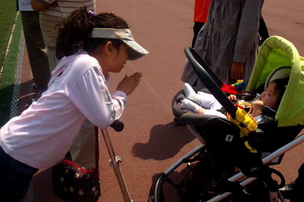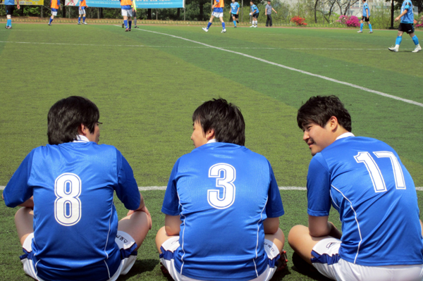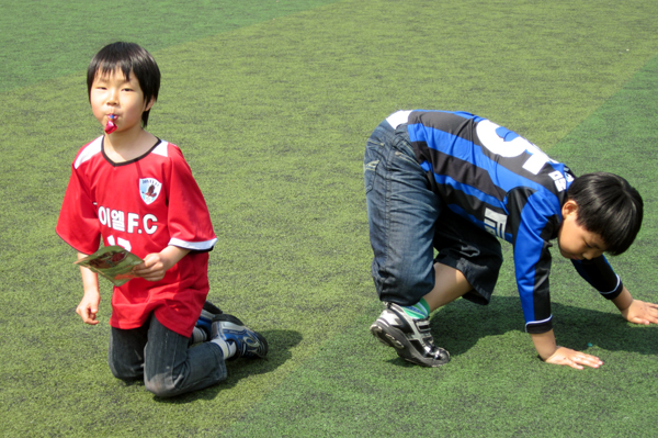 | ▲ 아빠 힘내세요! 나도 뛸 수 있는데... 축구대회 참가 선수 자녀들이 응원을 하고 있다. | ||