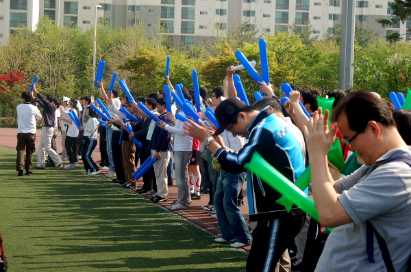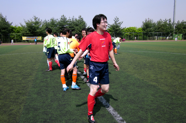 | ▲ 엇갈리는 희비. 이데일리-서울경제 경기 승부차기에서 이데일리 키커의 골이 들어가자 이데일리 응원단은 환호하는 반면 서울경제 응원단은 고개를 떨구며 안타까워하고 있다. | ||