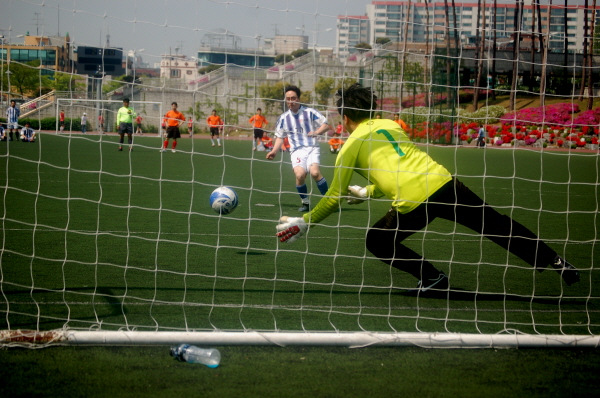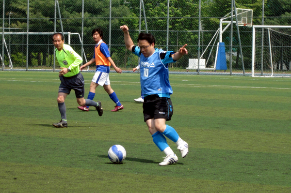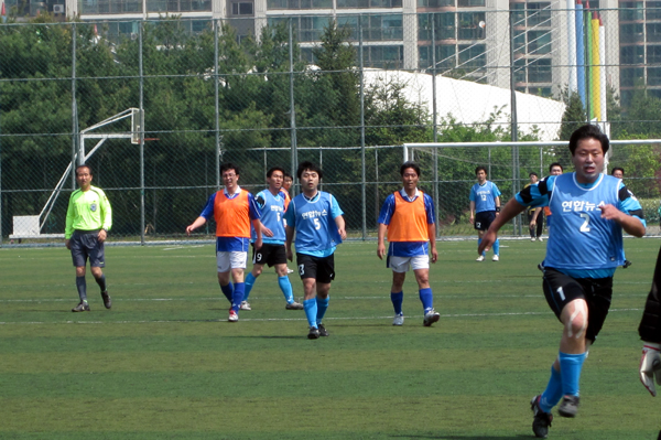 | ▲ 연합뉴스와 스포츠서울 경기 도중 연합뉴스 한 선수가 골을 잡으려 하고 있다. | ||