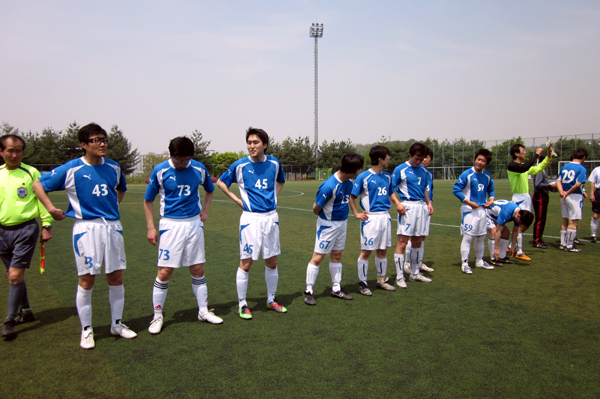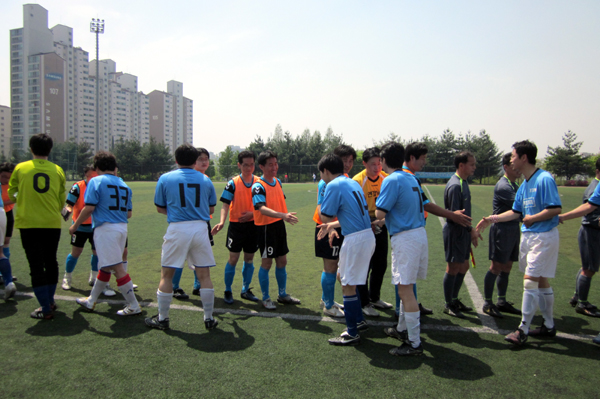 | ▲ 악수 나누는 한 때 한 식구. 경기를 펼치게 된 YTN·연합뉴스 선수들이 페어플레이를 약속하며 악수를 나누고 있다. | ||
