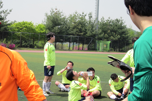 | ▲ 목탄다. 목타. 머니투데이와 헤럴드경제 선수들이 승부차기 직전 물을 마시고 있다. | ||