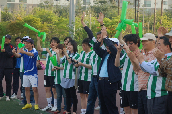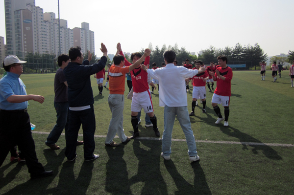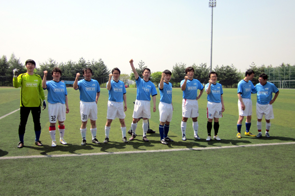 | ▲ 별무리구장에서 열린 동아일보-아시아경제의 경기에서 동아일보 응원단이 아시아경제를 1대 0으로 이긴 뒤 환호하고 있다. | ||