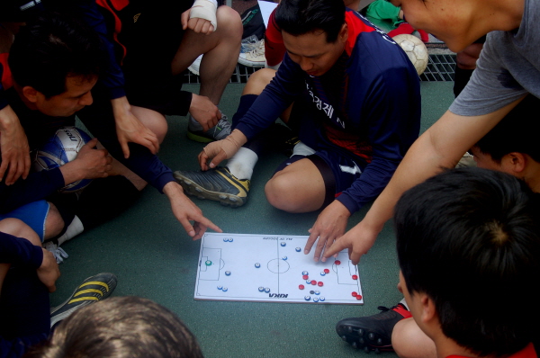 | ▲ “너는 코너킥 찰 땐 이쪽으로 들어와 주고….” 8일 한국경제TV 선수들이 경기 시작 직전 프로팀을 방불케 하는 전술 회의를 열고 있다. | ||