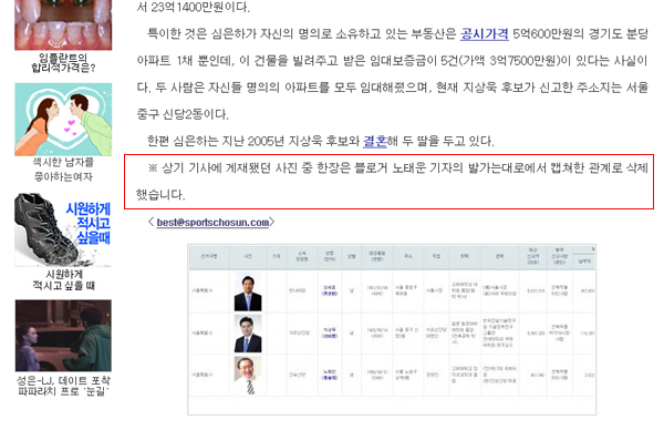 노씨는 기사에서 “지상욱 후보가 공개한 재산내역 중 가장 눈길을 끄는 부분은 심은하씨 명의의 예금”이라며 “심은하씨는 예금 16억8천200만원, 보험 5천158만원 등 17억원이 넘는 예금이 있다”고 밝혔다.