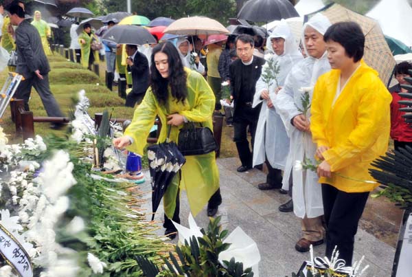 이날 광주시 북구 운정동 국립 5·18 민주묘지에서 열린 5·18광주민주화운동 30주년 기념식은 정부가 추모곡인 ‘임을 위한 행진곡’ 제창을 막아 반쪽행사로 끝나고 말았다. 별도의 기념식이 열린 옛 묘역인 망월동 묘지에서 추모객들이 헌화하고 있다. <광주매일신문 제공>