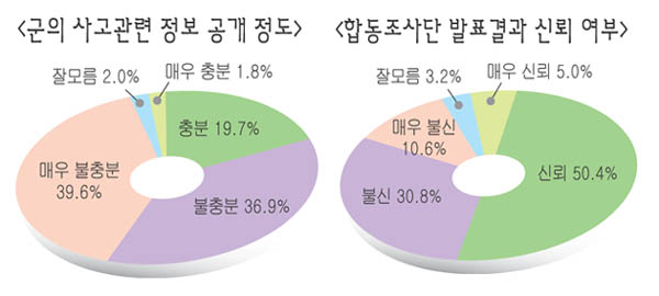 민·군합동조사단의 발표에 대해 55.4%가 신뢰(매우 신뢰 5.0%, 다소 신뢰 50.4%)한다고 답했다. 불신한다는 응답자는 41.4%(매우 불신 10.6%, 다소 불신 30.8%)였다.
