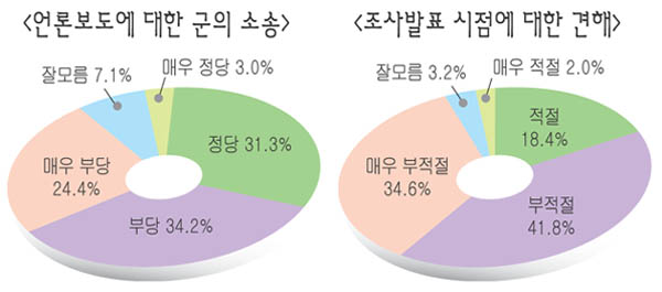천안함 관련 일부 언론의 보도와 인터넷 게시글에 대한 군 당국의 소송은 58.6%(매우 부당 24.4%, 부당한 편 34.2%)가 부당하다고 답변했다. 정당하다는 응답자는 34.3%(매우 정당 3.0%, 다소 정당 31.3%)를 기록했다.