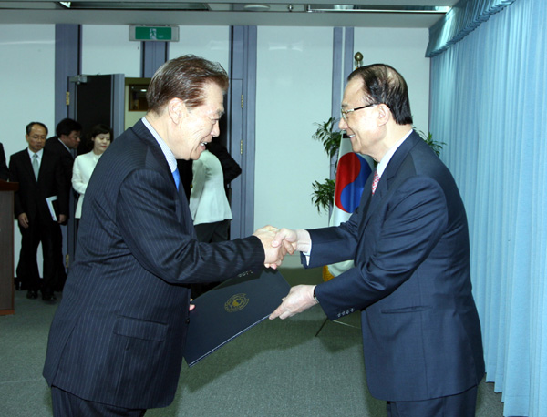 ▲ 김재우 방송문화진흥회 신임 이사장은 KBS 손병두 이사장과 마찬가지로 기업인 출신이다. 양대 방송사에 기업인 출신이 이사장에 임명된 것은 전례가 없는 일이다. 사진은 최시중 방송통신위원장이 지난 14일 방문진 보궐이사로 선임된 김재우씨(왼쪽)에게 임명장을 수여하고 있는 장면.(방송통신위원회 제공) |