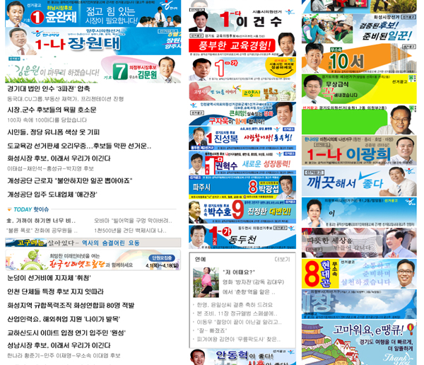 경인일보도 양옆을 비롯해 중앙에 20여개의 선거광고 배너를 달았다. 중부일보 역시 홈페이지 하단을 후보자 광고로 꽉 채웠다. 이 밖에도 강원도민일보, 강원일보, 부산일보, 광주일보 등 전국 신문들에서 이런 현상이 나타나고 있다.