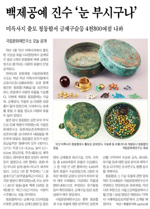 전북도민일보(사장 임병찬)는 5월27일자 1면에 3단 박스로 ‘백제공예 진수 ‘눈 부시구나’’ 기사를 청동합에서 출토된 금제장식, 구슬류 등의 사진과 함께 실었다. 전북도민일보는 기사에서 “지난해 1월 익산 미륵사지에서 금동사리호 등과 함께 출토된 청동합에서 금제구슬 등 4천8백여 점의 보물이 들어 있었다”고 보도했다.