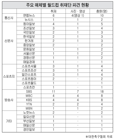 8일 대한축구협회(KFA)의 집계에 따르면 남아프리카공화국에 파견된 국내 언론사 취재진은 모두 1백26명이다. 중앙 및 지역 일간지와 통신사 취재진은 76명으로 취재기자가 52명, 사진기자(영상 포함)가 24명이다.
