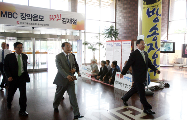 ▲ 7일 서울 여의도 MBC 사옥 1층 로비에서 김재철 사장이 부당 징계 철회를 요구하며 농성 중인 노조원들 옆으로 출근하고 있다.(MBC 노조 제공) |