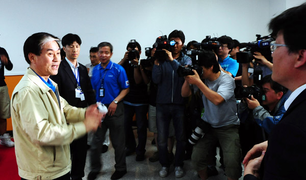 | ▲ 나로호의 발사가 소방시설 오작동으로 중단된 가운데 9일 오후 전남 고흥군 외나로도 나로우주센터 브리핑룸에서 이주진 원장이 상황 설명을 마친 후 기자들의 질문에 답하고 있다.(뉴시스) | ||