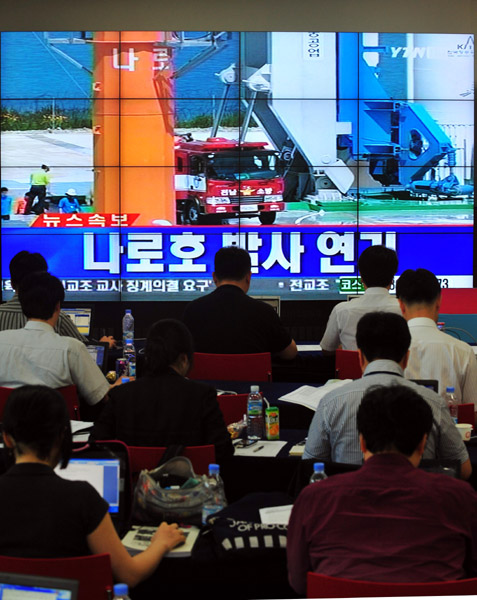 | ▲ 나로호가 9일 발사대 주변 소방설비 문제로 발사가 중지되자 전남 고흥 외나로도 나로우주센터 브리핑룸에서 기자들이 속보를 전하고있다.(뉴시스) | ||