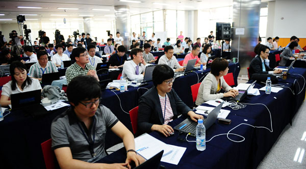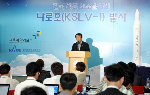 | ▲ 나로호 2차 발사일인 9일 오전 전남 고흥군 외나로도 나로우주센터 프레스센터에서 기자들이 교육과학기술부 편경범 대변인의 브리핑을 취재하고 있다.(뉴시스) | ||